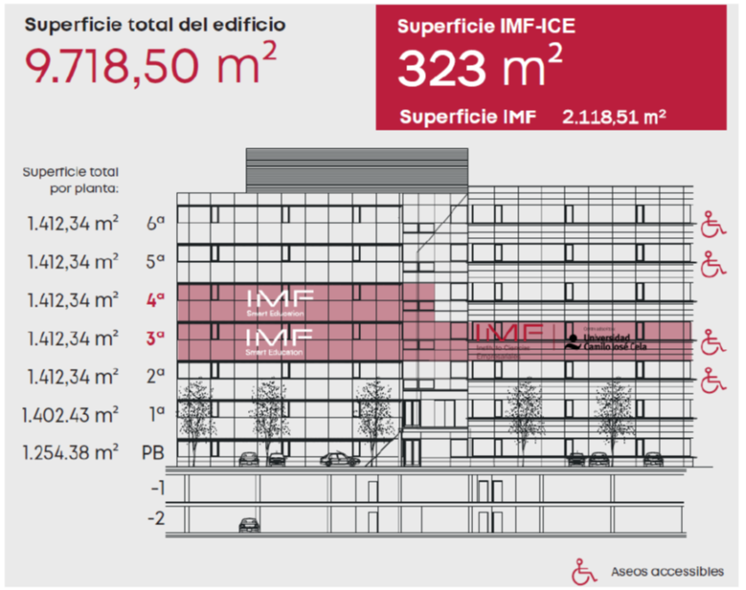 Las instalaciones de IMF-ICE forman parte del conjunto de instalaciones que el Grupo IMF dispone en el mismo edificio, concretamente, en la misma planta tercera y en la mitad de la planta cuarta, y que suman un total de 2.118,51m2, conforme a la distribución que se muestra en los planos adjuntos y en la siguiente imagen: