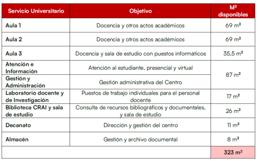 La siguiente tabla muestra los espacios y los servicios ofertados con relación a los metros cuadrados que ocupan: